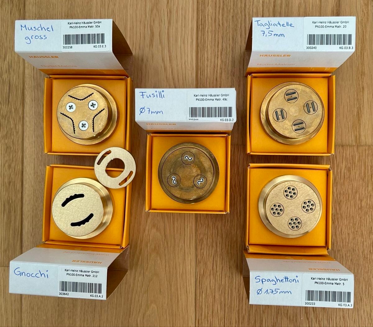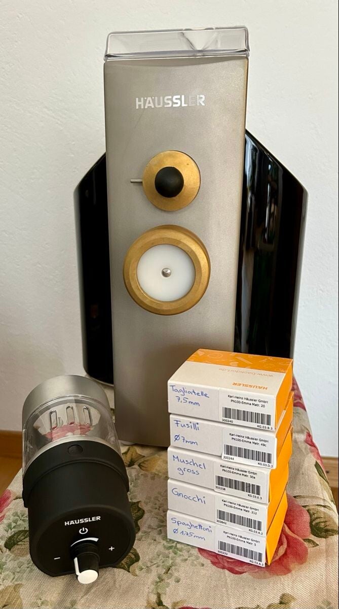 Wir haben die EMMA mit dem gesamten Zubehör im September 2024 gekauft. Zum Zubehör gehören unter anderem ein Nudelschneider mit Betriebsanleitung, 5 Matrizen, 4 PVC-Nudelhorden und eine selbstgenähte Abdeckhaube.